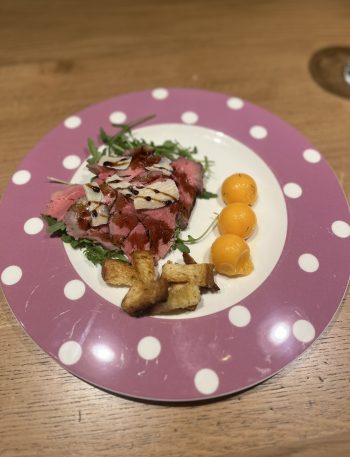 Un antipasto gourmet di filetto di manzo affumicato al barbecue con rucola, parmigiano e melone marinato, perfetto per sorprendere gli ospiti con gusto.